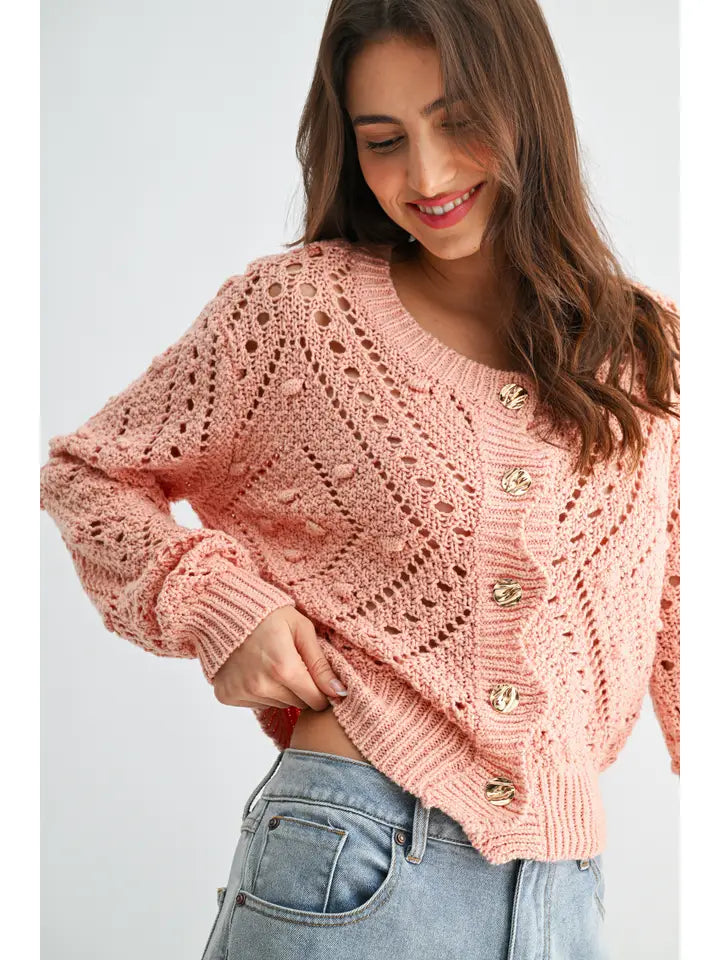 Romantic texture meets everyday coziness in the Darling Rosé Cardigan—a beautifully detailed layer designed to feel both timeless and softly feminine. Crafted in a warm blush-rose hue, this openwork crochet-inspired knit features intricate stitching, gently billowed sleeves, and statement gold buttons that add the prettiest touch of shine.