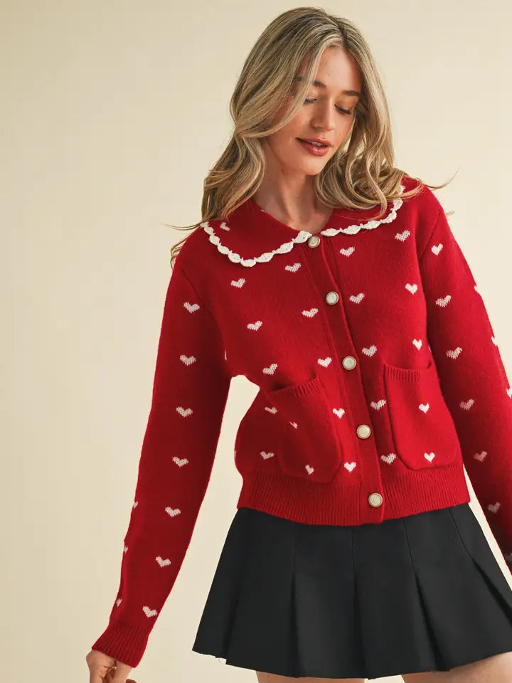 Chilly days are that much better when you’ve got this doll collar sweater cardigan! Cozy knit shapes this must-have cardigan that has doll collar neckline framed by drop shoulder long sleeves with scalloped cuffs. Covered, functional buttons adorn the front of the relaxed bodice.